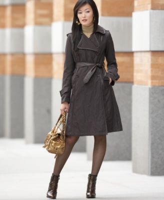 Via Spiga Double-Breasted Leather-Trim Trench Coat- Via Spiga puts a modern spin on the classic trench, with leather trim and a subtle sparkling finish.